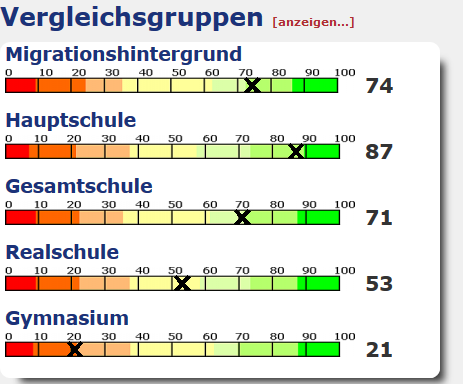 Bei den Kennziffern handelt es sich um Prozentränge, die die mit einer bestimmten Fehlerzahl erreichte relative Leistung in Form dynamisch generierter Skalen visualisieren. Dieses rein statistische Rangmaß wird abschließend durch eine individuelle Förderempfehlung ergänzt, die auf zu beobachtende oder zu fördernde Schwächen hinweist, welche im ausgewiesenen Fehlerbereich zum Tragen kommen.
